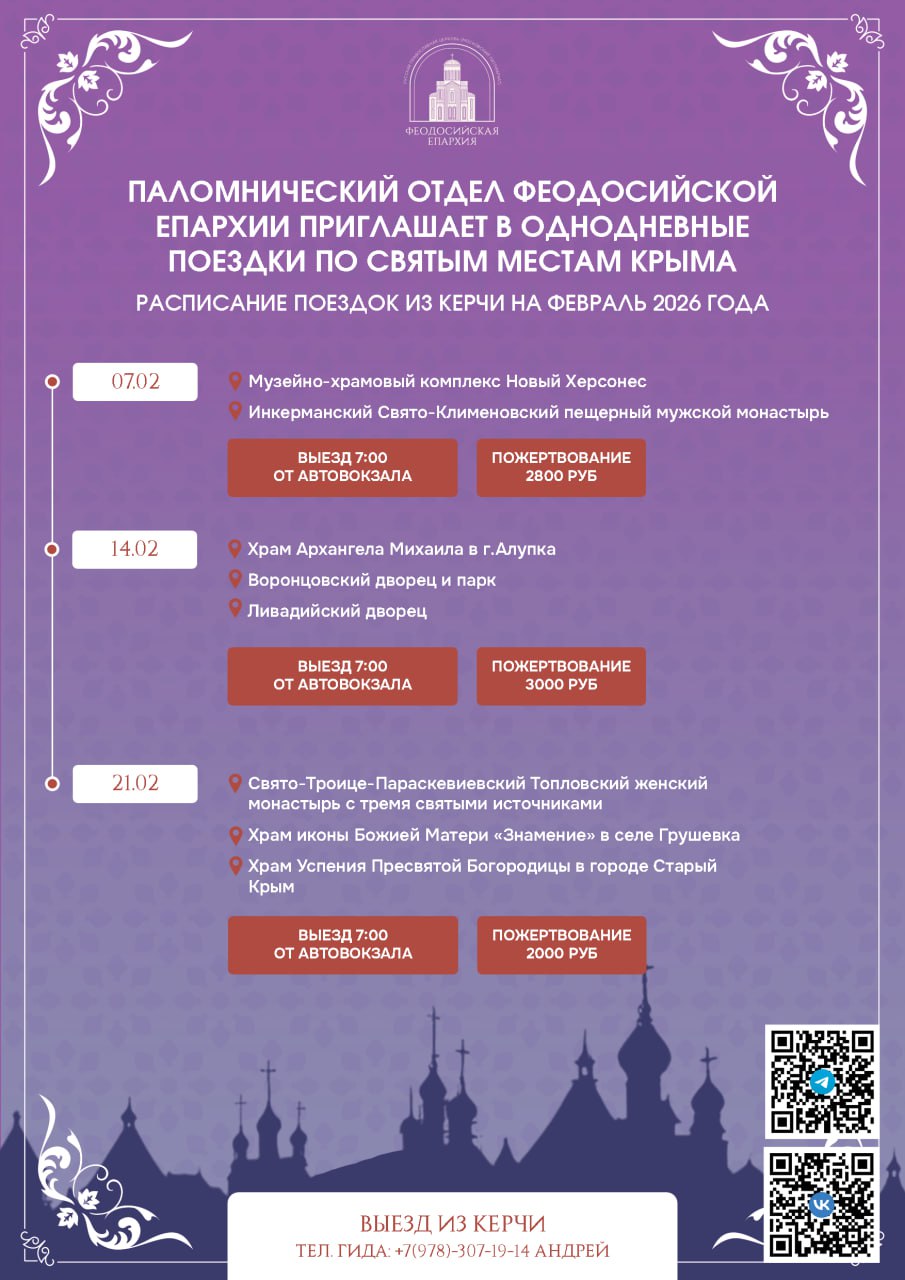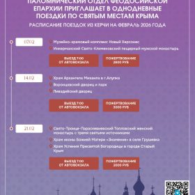 Паломнический отдел Феодосийской епархии приглашает всех желающих принять участие в однодневных паломнических поездках по святым местам Крыма с выездом из Керчи. Это уникальная возможность прикоснуться к духовному наследию нашего края, укрепить веру и получить благословение.